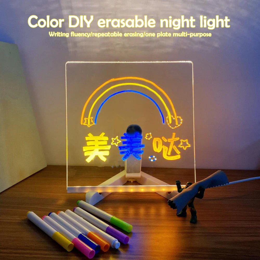 Transformez vos notes, pense-bêtes et gribouillis en œuvres d'art lumineuses grâce au tableau d'affichage LED – bloc-notes acrylique à monter soi-même avec 7 stylos . Ce tableau moderne et attrayant vous permet de vous exprimer en couleurs vives grâce aux stylos fluorescents inclus – idéal pour l'inspiration quotidienne, les messages familiaux, les menus de café ou la décoration des fêtes.